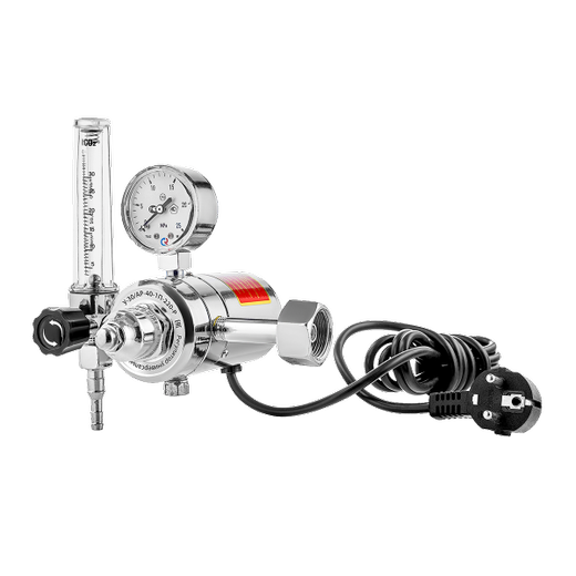 Регулятор расхода газа У-30/АР-40-П-220-Р с поверенным манометром и расходомером для углекислого газа и аргона предназначен для понижения давления поступающего из баллона газа и автоматического поддержания постоянным заданного расхода при питании постов, установок в среде защитных газов, а также смежных процессов. Регулятор оснащен встроенным подогревателем на 220 вольт с заземлением.